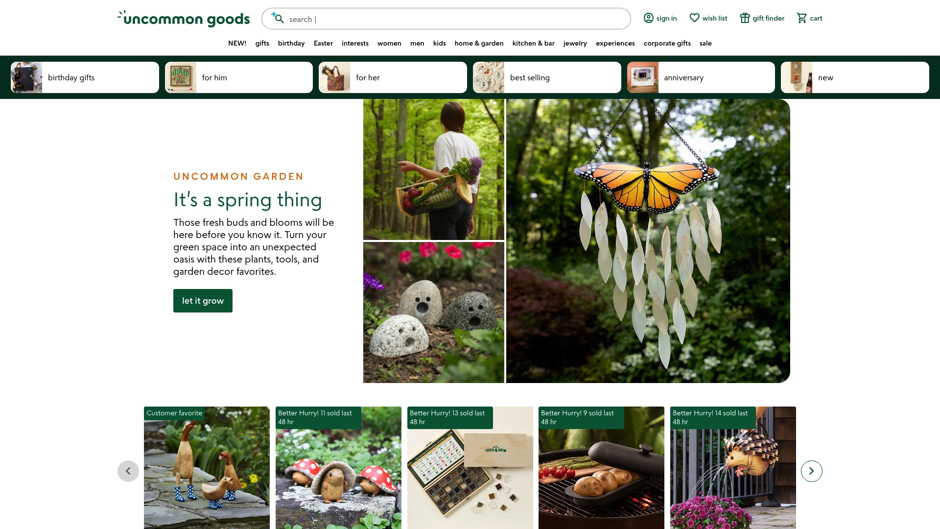 Uncommon Goods offers a curated selection of creative, artisan items that work well as memorable gifts or thoughtful home accents. The site emphasizes environmentally friendly and artisan made products while keeping category navigation focused on occasions and recipients.