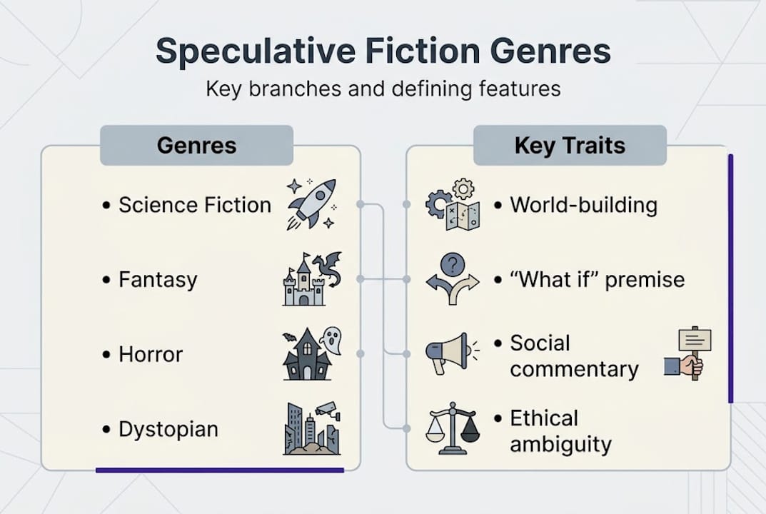 | Broad genre umbrella | Speculative fiction covers science fiction, fantasy, horror, dystopian, and more. |