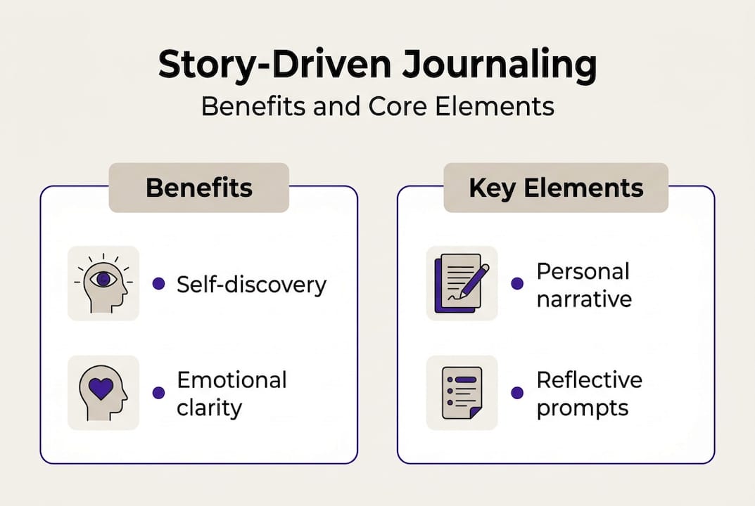 - Story-driven journaling uses narrative techniques to facilitate self-discovery and personal transformation.